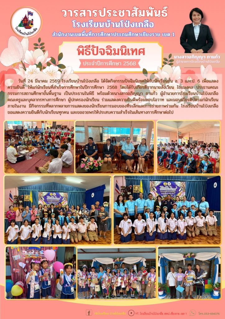 วันที่ 24 มีนาคม 2569 โรงเรียนบ้านโป่งเกลือ ได้จัดกิจกรรมปัจฉิมนิเทศให้กับนักเรียนชั้นอนุบาลปีที่ 3 และประถมศึกษาปีที่ 6 เพื่อแสดงความยินดีให้แก่นักเรียนที่สำเร็จการศึกษาในปีการศึกษา 2568 โดยได้รับเกียรติจากนายสังเวียน ไชยมงคล ประธานคณะกรรมการสถานศึกษาขั้นพื้นฐาน เป็นประธานในพิธี พร้อมด้วยนางสาวอภิญญา ถาแก้ว ผู้อำนวยการโรงเรียนบ้านโป่งเกลือ คณะครูและบุคลากรทางการศึกษา ผู้ปกครองนักเรียน ร่วมแสดงความยินดีพร้อมมอบโอวาทและเกียรติบัตรแก่นักเรียนภายในงานมีกิจกรรมที่หลากหลาย การแสดงของนักเรียน การมอบของที่ระลึกและการถ่ายภาพร่วมกัน โรงเรียนบ้านโป่งเกลือขอแสดงความยินดีกับนักเรียนทุกคนและขออวยพรให้ประสบความสำเร็จในเส้นทางการศึกษาต่อไป